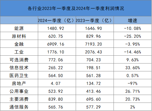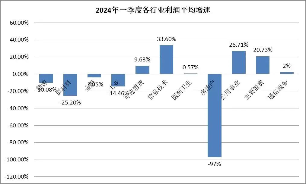 从行业增速来看,信息技术行业净利润同比增33.6%,领先其他行业,公用事业、主要消费净利润同比增26.71%及20.73%,增速较快,可选消费、医药卫生、通信服务,较2023年一季度同比增长。与此同时,房地产业净利润同比下降97%,为下降幅度最大行业,原材料行业净利润同比下滑较严重,同比下降25.2%,此外,能源、金融、工业等行业,2024年一季度净利润也有不同程度下降。
