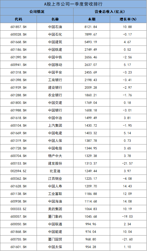 其中,“两桶油”中国石油、中国石化营收规模最大,一季度营收分别达8121.84亿元、7899.67亿元。剔除金融及石油石化企业后,中国建筑以超5000亿的营收位居第一。