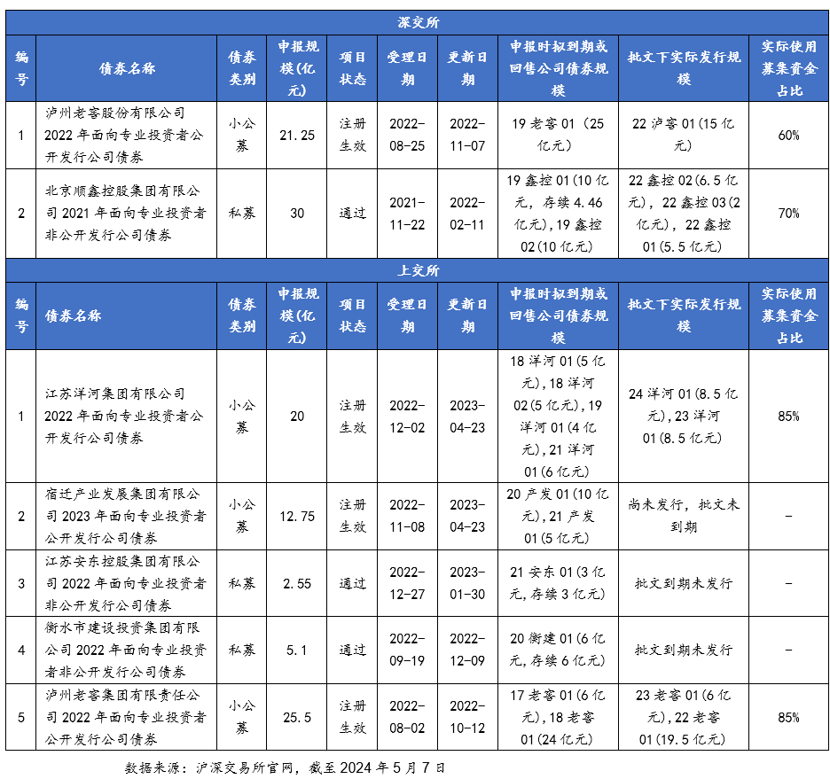 从沪深两所的公司债券申报情况来看,白酒行业主体拟申报的公司债券规模基本为临近到期公司债券余额的85%,实际利用募集资金偿还到期旧债的占比可能低于85%。我们整理了沪深两所主要白酒行业企业的申报规模情况及其实际发行情况,梳理如下:
