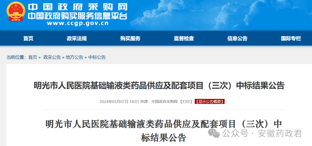明光市人民医院基础输液类药品供应及配套项目(三次)中标结果公告
