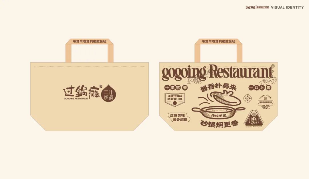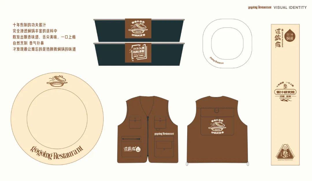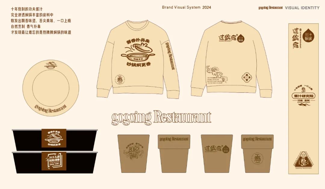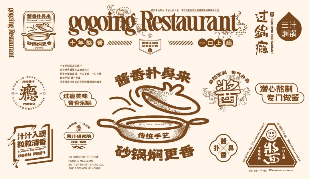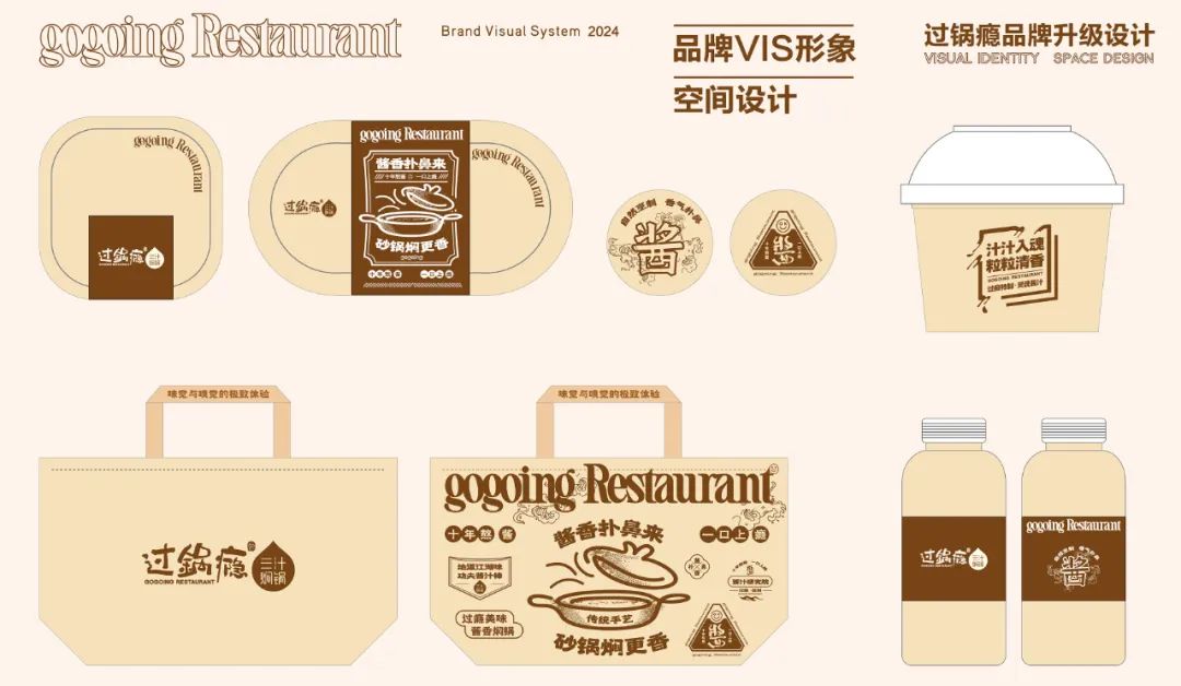 2024年过锅瘾餐饮进行系统设计/全新升级,品牌核心体现“酱香扑鼻来,砂锅焖更香”的核心产品进行优化,以砂锅为核心概念,加深砂锅焖制的传统美食概念,体现产品本真的食材原味,将砂锅焖更香进行产品提炼,同时强化已有的品牌印象,“十年熬酱,一口上瘾”,体现焖锅的味觉体验,以麻辣汁为核心的产品推入市场,此次升级从品牌标准色、辅助元素、以及产品包装、砂锅形象等进行系统产品、VIS形象升级,强化品牌的特性及概念表达,以更高要求及更佳体验打造地道、本真原味的传统美食。