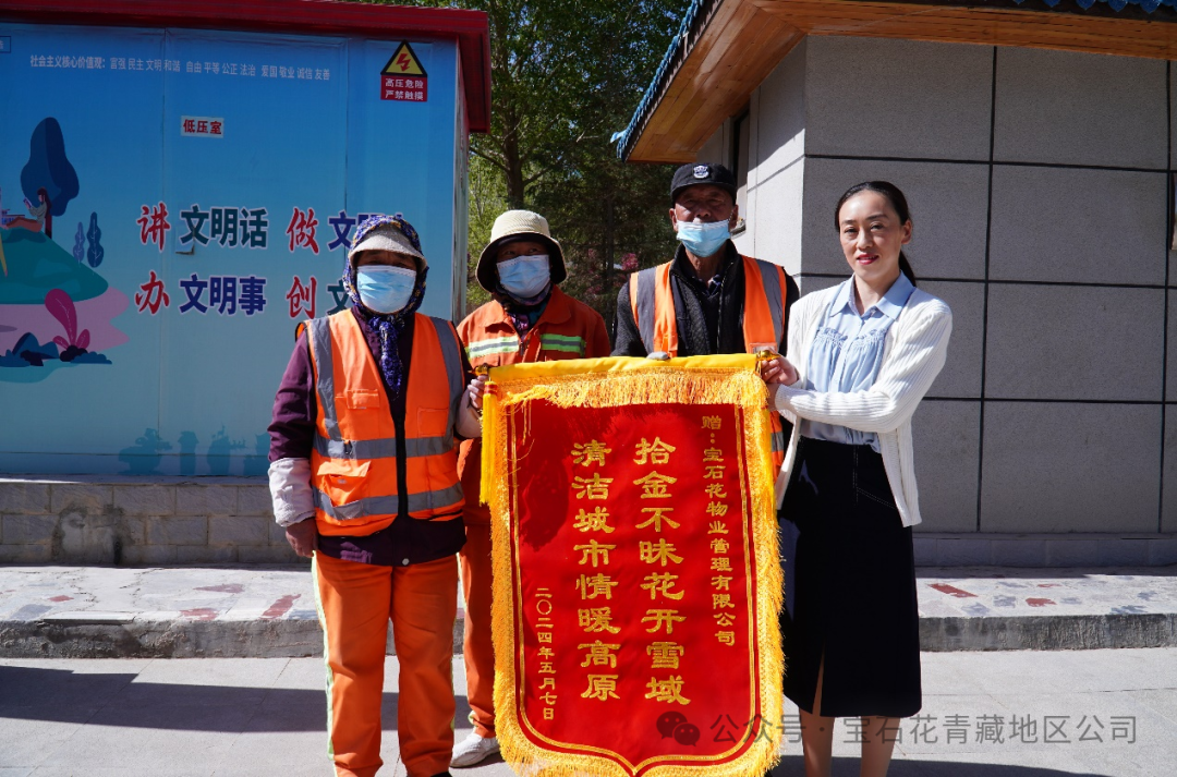 2024年5月8日,为表谢意,市民燕女士为公司送来一面绣有“拾金不昧花开雪域,清洁城市情暖高原”的锦旗。