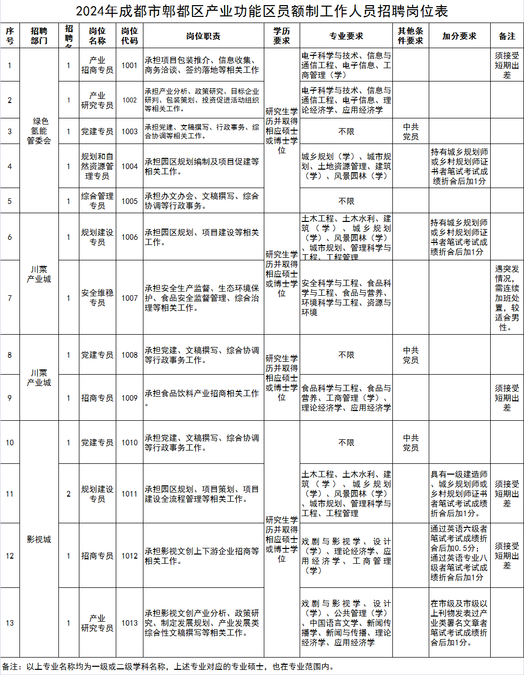 具体岗位要求及条件详见附件《2024年成都市郫都区产业功能区员额制工作人员招聘岗位表》(以下简称《岗位表》)。