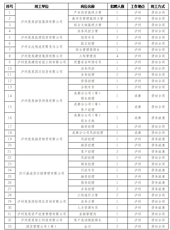 详见附件《泸州发展控股集团有限公司及旗下企业2024年春季招聘岗位需求表》(附件1)。