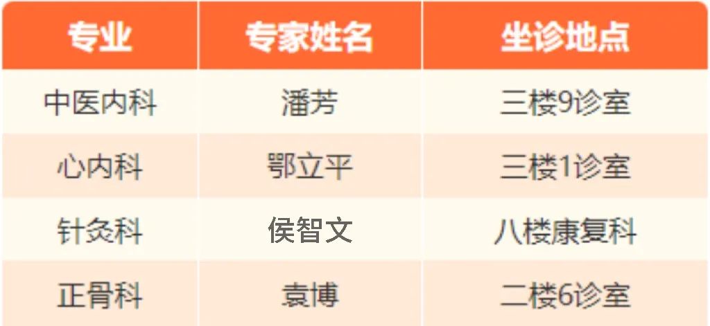 5月11日(本周六),北京市和平里医院将派出中医内科、心内科、针灸科、推拿正骨科四个专业共四名专家来院坐诊,具体信息如下: