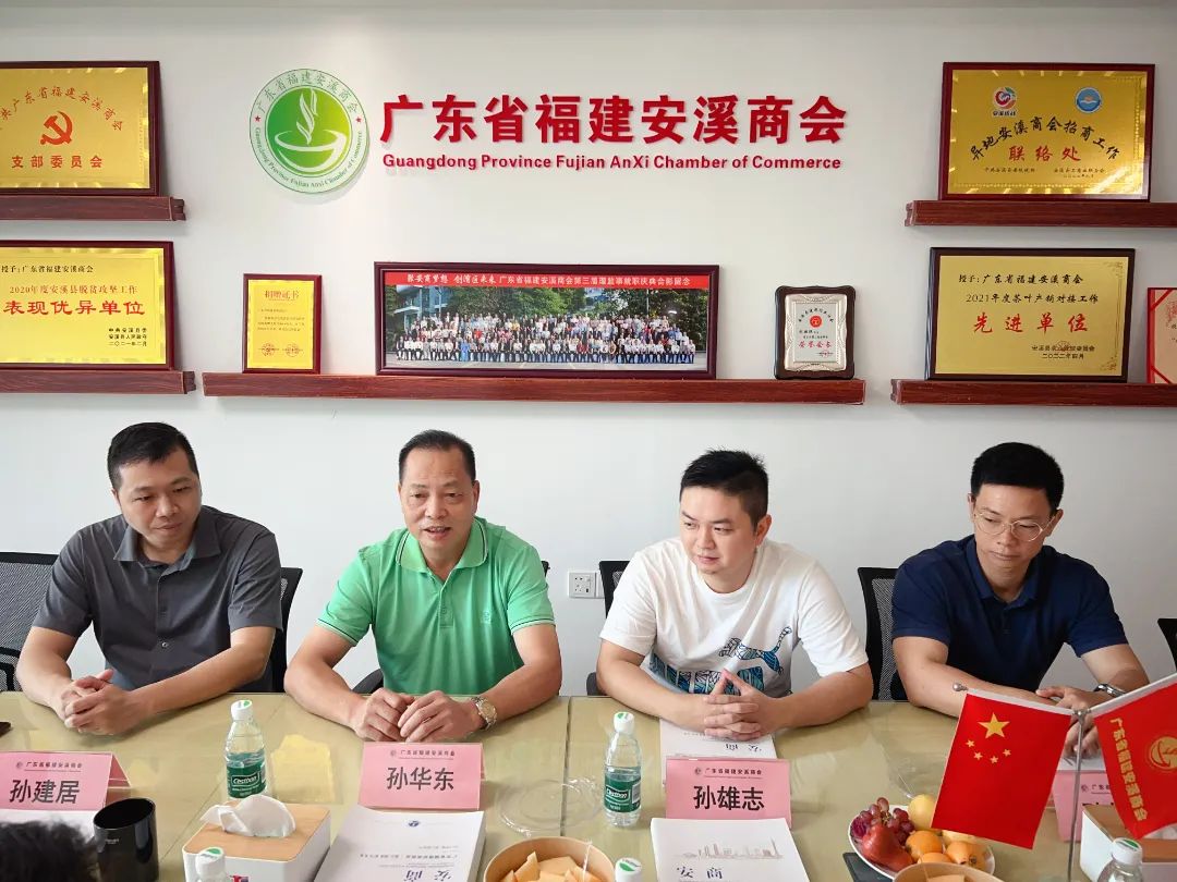 孙华东秘书长代表商会对国健公益助学促进会一行的到来表示热烈欢迎。孙秘书长首先简要介绍了家乡安溪的概况和安溪近几年来日新月异的发展,接着分享了商会的发展历程,组织架构,购置永久会址,奖学助学活动,以及商会爱心公益部的发展情况等。他表示,自第三届理事会换届以来,在刘国瑛会长的带领下,广东省福建安溪商会积极助力家乡振兴,资助贫困学子,投身公益事业,坚持践行社会责任,获得有关部门和社会各界的广泛好评。今后商会也会积极链接各社会慈善资源,为社会传递一份爱与温暖,激励更多人积极参与公益事业,为助力广东省高质量发展贡献安商力量。