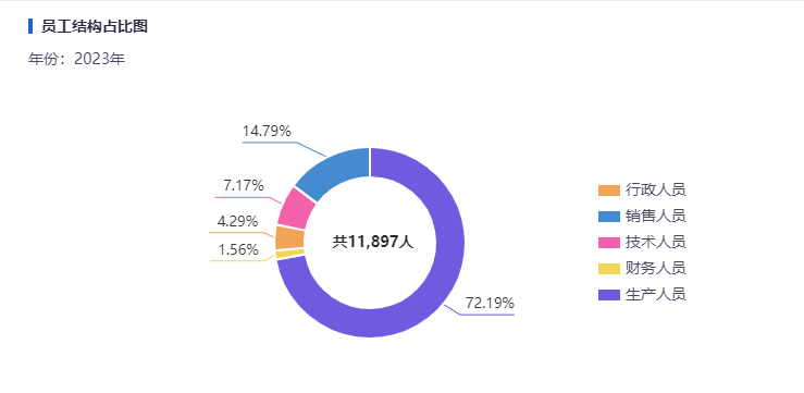 2023年安琪酵母的员工人数达到11897人,其中72.19%的是生产人员,14.79%的是销售人员,7.17%的是技术人员。