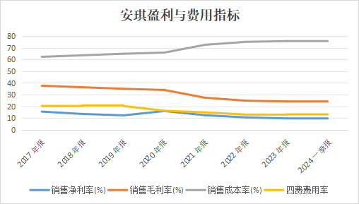 近几年来,安琪酵母的销售成本抬升、毛利率下降、净利率也下降,好在费用率有所降低。费用率的降低是扩大规模带来的摊分费用下降。