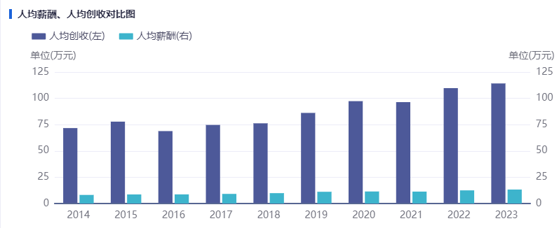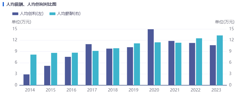 人员薪酬持续上涨,人均创收持续上涨,人均创利则在一定的波动。