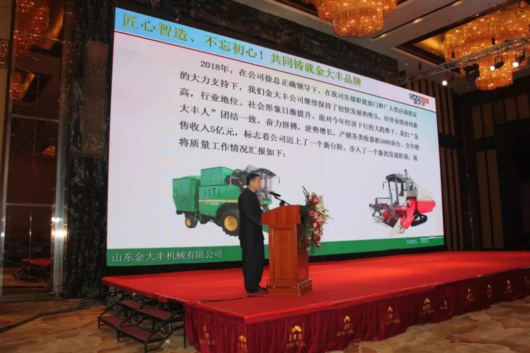 质量部经理卞延峰在会上做匠心制造,不忘初心,共同铸就金大丰品牌的报告。他表示,为确保全线产品与推广鉴定产品的一致性,满足用户需求,公司对生产产品进行严格控制,使产品符合国家法律、法规及标准要求,建立健全各项规章制度,做到有法可依、有章可循、奖罚分明。引进各项计量检测仪器,完善外协配套件检验流程,确保产品质量保障。合格供应商准入需满足“三化”要求,规模化、专业化和历史悠久化。依据“三化”要求、优胜劣汰的原则,以“零部件质量、供货及时性、服务及时性、性价比、诚信度”等方面,进行综合考评,分出“A\B\C”类三类企业。产品质量不但包含设计质量、配套件质量、制造质量,还包括使用质量和服务质量,金大丰产品无论是清洁度、含杂率,还是损失率,都优于国家标准指标,使我们的用户买的放心、用的称心,誉满口碑。2019年公司质量目标:零件一次交检合格率≥95%,三包配件费比上年度降低15%,顾客满意度≥90%。