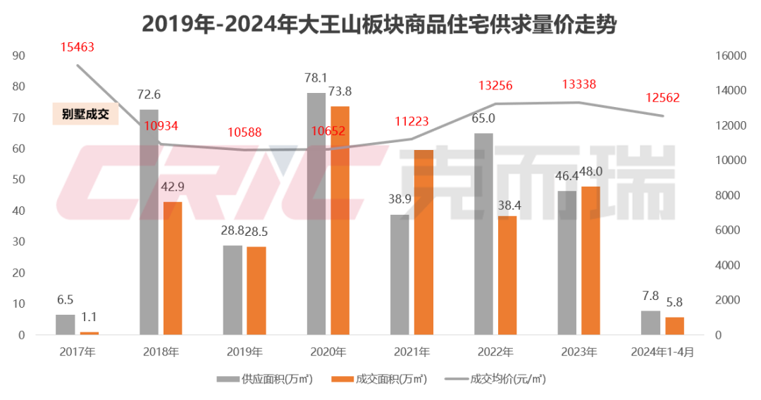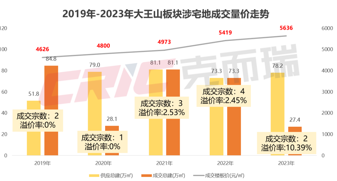 从土地市场表现来看,大王山起步较晚,近年来得益于洋湖板块的飞速发展带来的客户外溢以及地铁3号线的开通,大大助力板块升级,目前已进入价值兑换期。5年时间里,片区土地成交楼板价稳步上行,2023年升至5636元/㎡。