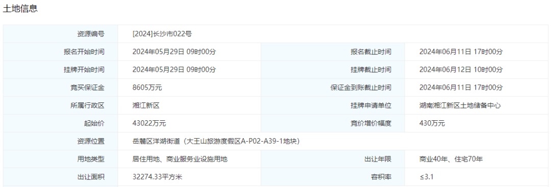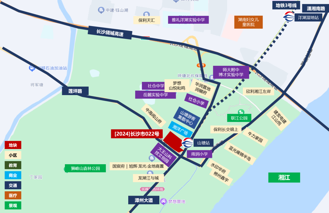 5月9日,长沙市大王山文旅新城板块[2024]长沙市022号商住用地块挂牌,宗地东侧紧邻地铁三号线山塘站。