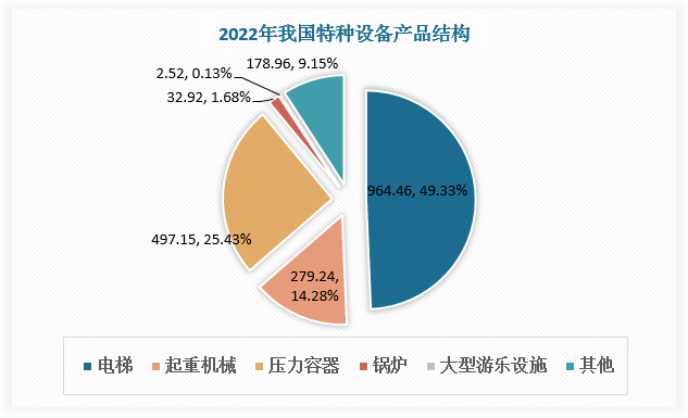 从产品结构看,2022年我国特种设备中电梯数量最多,达964.46万台,占比接近50%。其次是压力容器和起重机械,分别为497.15万台、279.24万台,分别占比25.43%、14.28%。