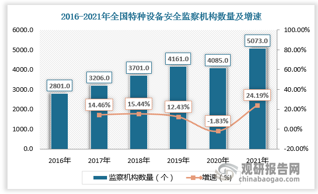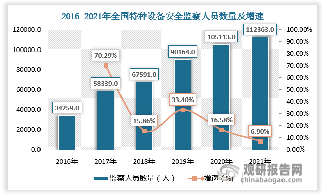 随着相关政策发布,我国特种设备市场监管趋向严格。2016-2021年全国设立特种设备安全监察机构数量由2801个增长至5073个,特种设备安全监察人员数量由34259人增长至112363人。