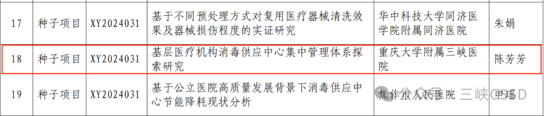 为进一步加强消毒供应质量控制能力建设和水平,提升消毒供应人员的科研能力,国家卫生健康委医院管理研究所启动消毒供应管理创新研究项目课题申报工作,重庆大学附属三峡医院陈芳芳申报的《基层医疗机构消毒供应中心集中管理体系探索研究》课题喜获立项。