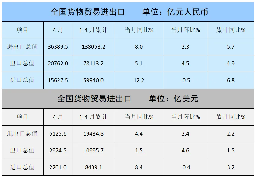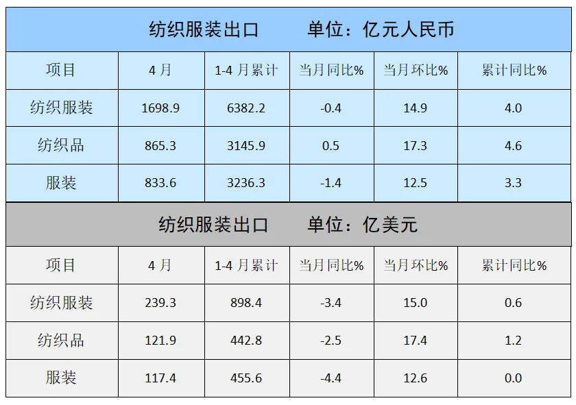 海关总署5月9日发布的最新数据显示,稳外贸政策不断显效、海外进口商逐渐进入补库存周期、企业信心提振等利好因素共同拉动4月纺织服装出口降幅较上月大幅收窄。按美元计,当月纺织服装出口额239.3亿美元,同比下降3.4%,降幅较3月收窄14个百分点。1-4月纺织服装累计出口898.4亿美元,同比保持0.6%的增长。其中,纺织品累计出口同比增长1.2%,服装累计出口与去年持平。