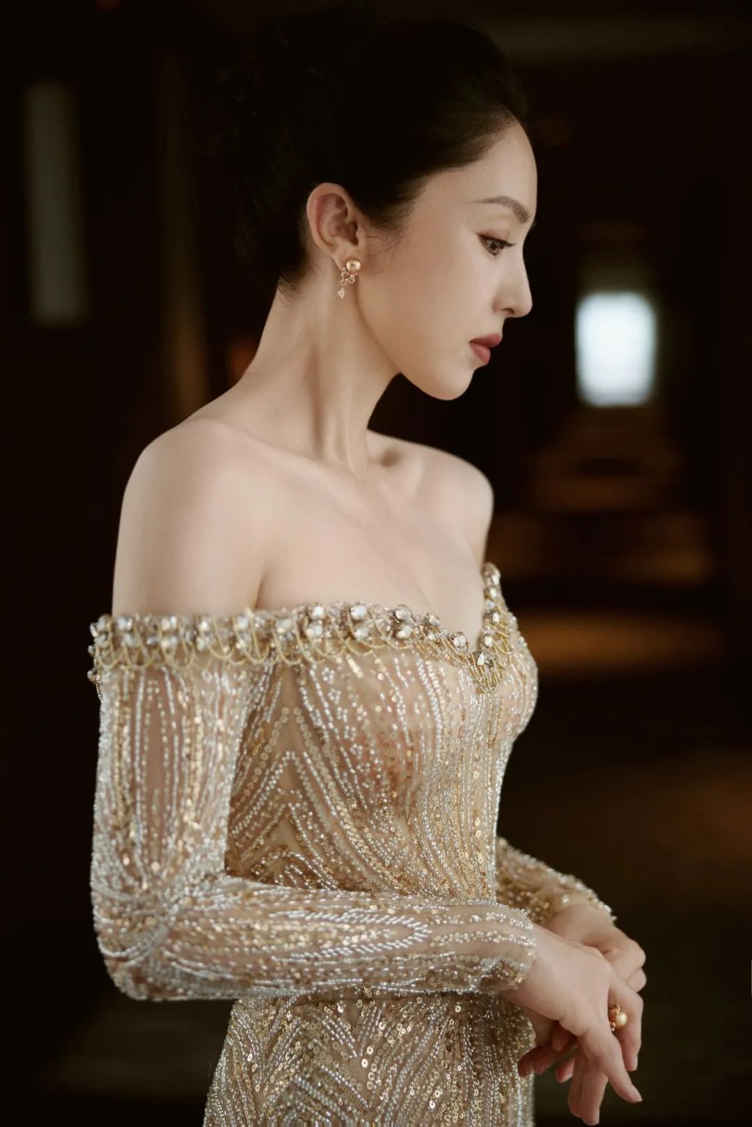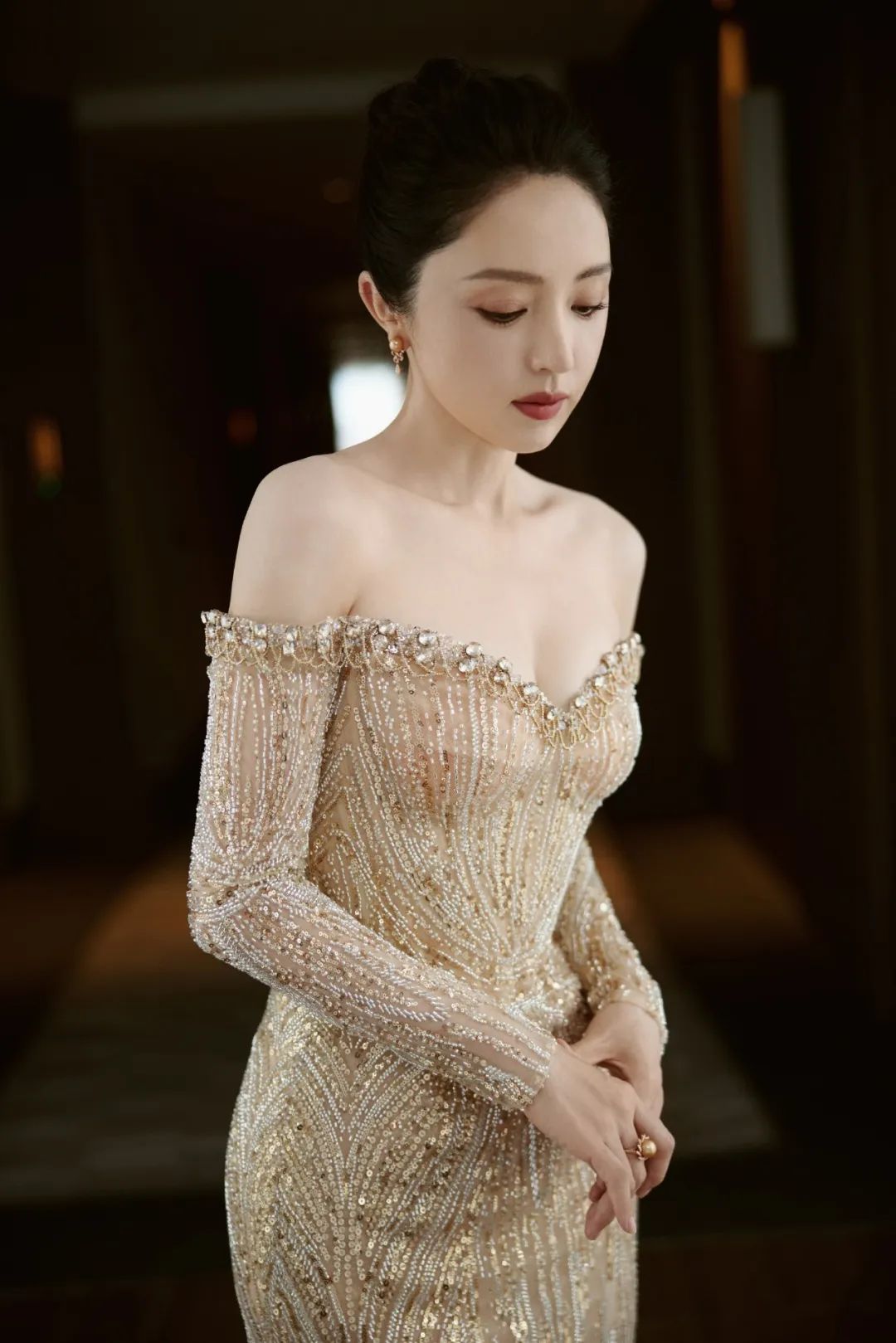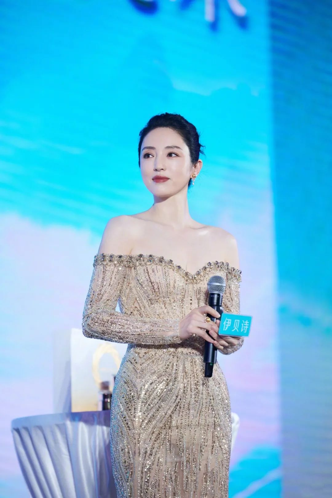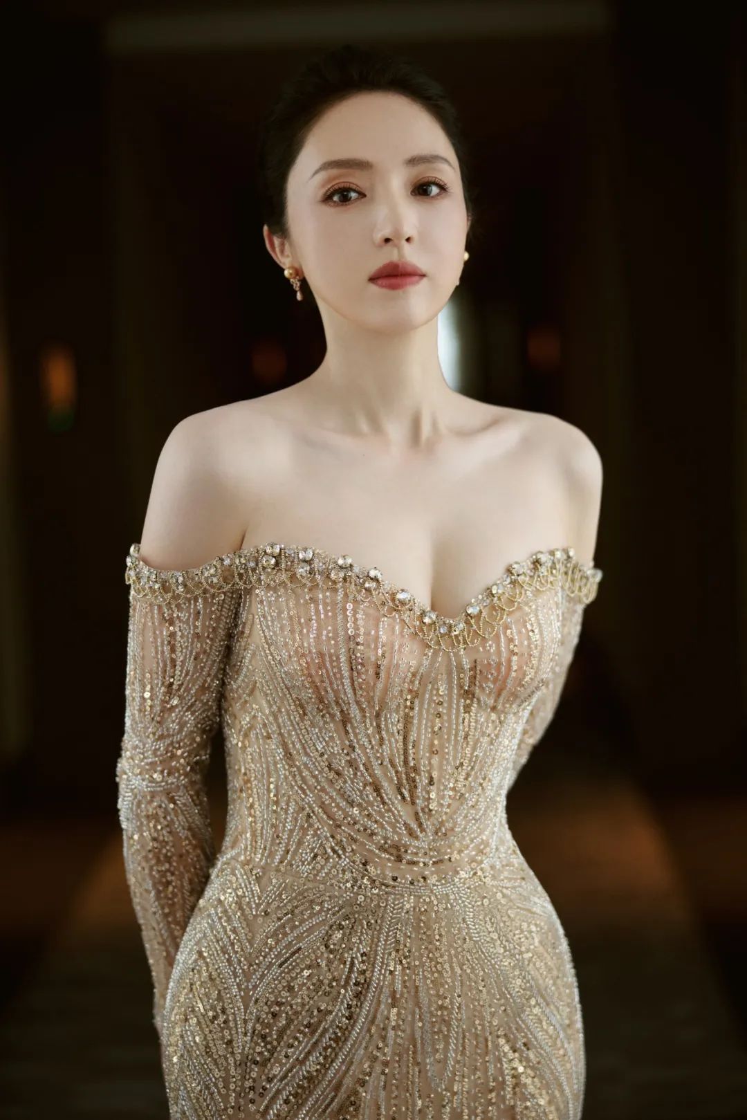 董璇在今天最新的活动造型中展现出了她的优雅与魅力。她身着一袭华丽的金色礼服,长裙的设计彰显了她的高贵气质。长袖和露肩的设计巧妙地展示了她的颈部线条和纤细的臂膀,同时礼服上的闪亮珠子和亮片在灯光下熠熠生辉,使她在人群中格外引人注目。董璇的妆容精致而典雅,黑色的秀发披肩,显得她的脸庞更加娇小。鲜艳的唇色增添了几分女性的妩媚,而她的微笑则散发出温暖与亲切的气息。