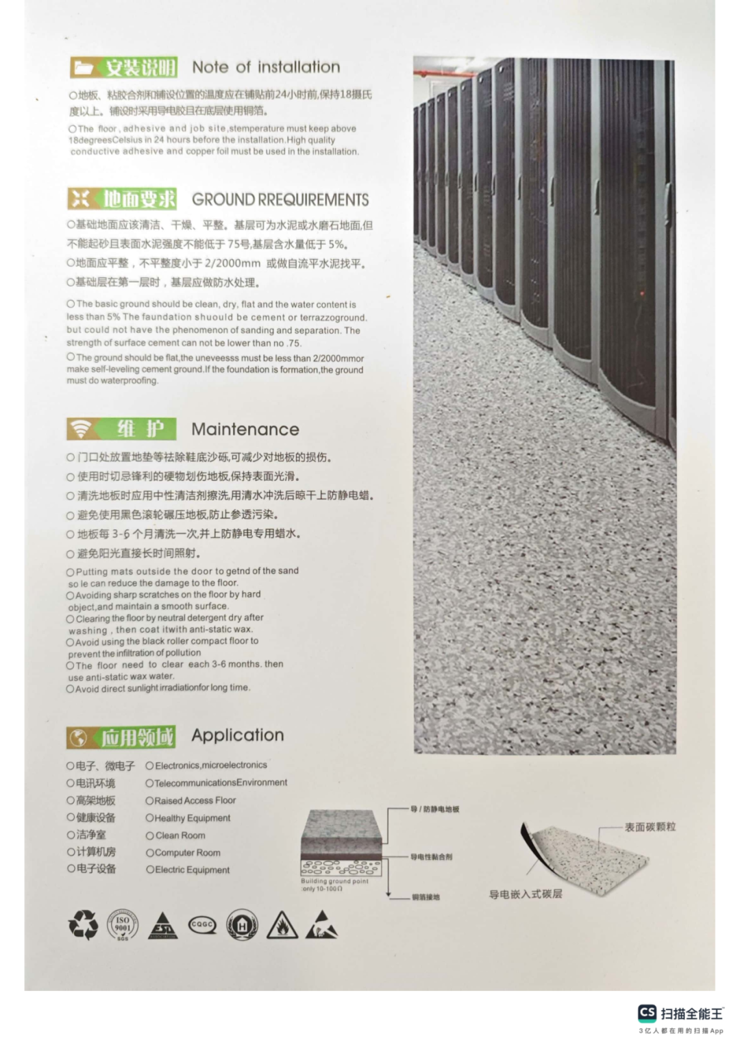 防静电性能卓越,各项检测都是国标标准!广泛用于电子厂房,净化车间等防静电要求的场所。
