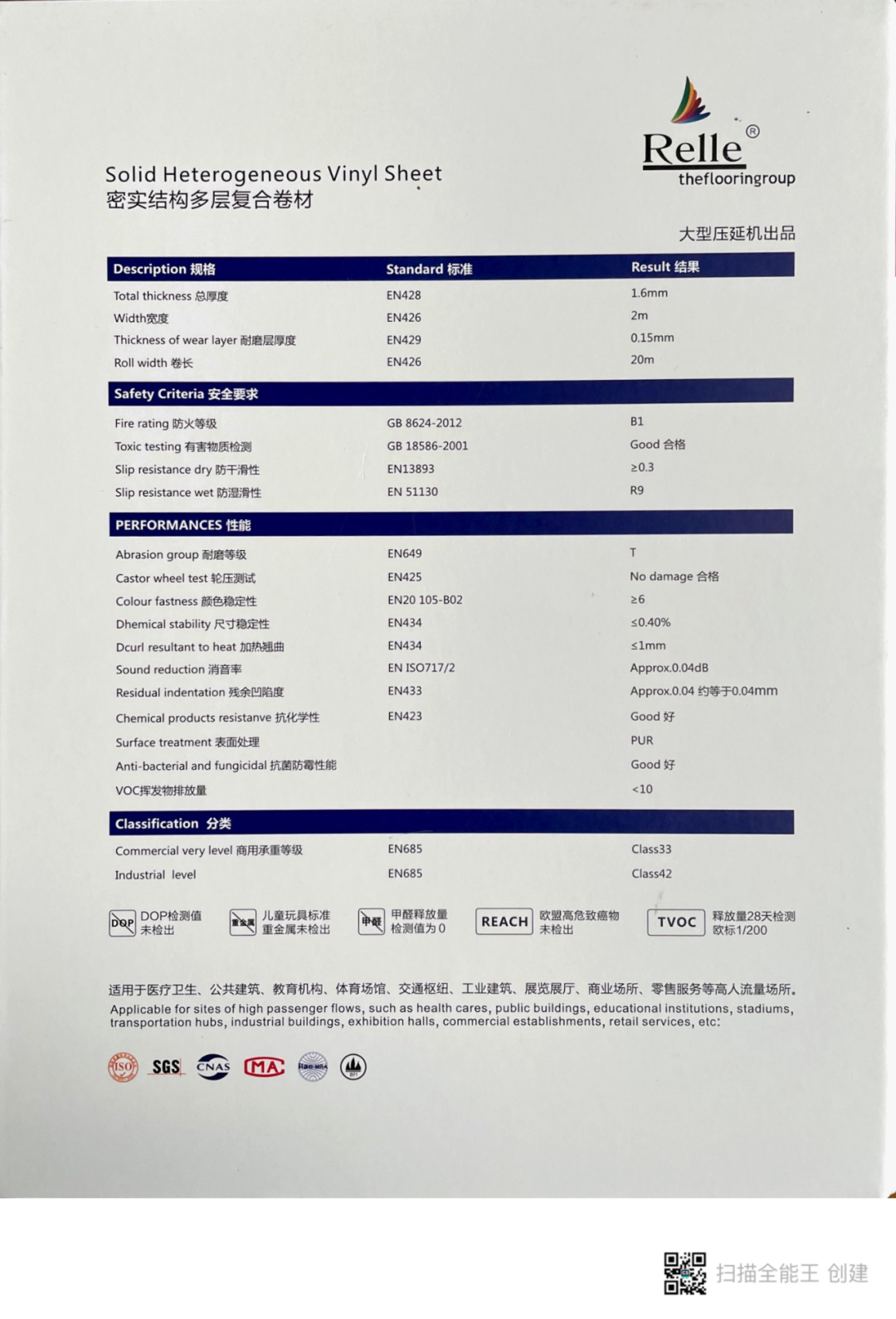 多层复合型PVC地板就是说它是有多层结构的,一般是由4~5层结构叠压而成,一般有耐磨层(含UV处理)、印花膜层、玻璃纤维层、弹性发泡层、基层等。具有防滑耐磨、环保抗菌等特性,适用于医疗卫生、公共建筑、教育机构、幼教系统、体育场馆、交通枢纽、工业建筑、展览展厅、商业场所、办公场所、工厂车间、零售服务等高人流量场所。