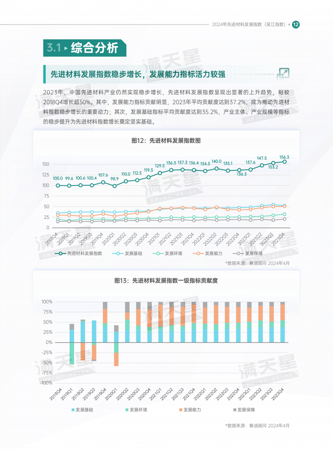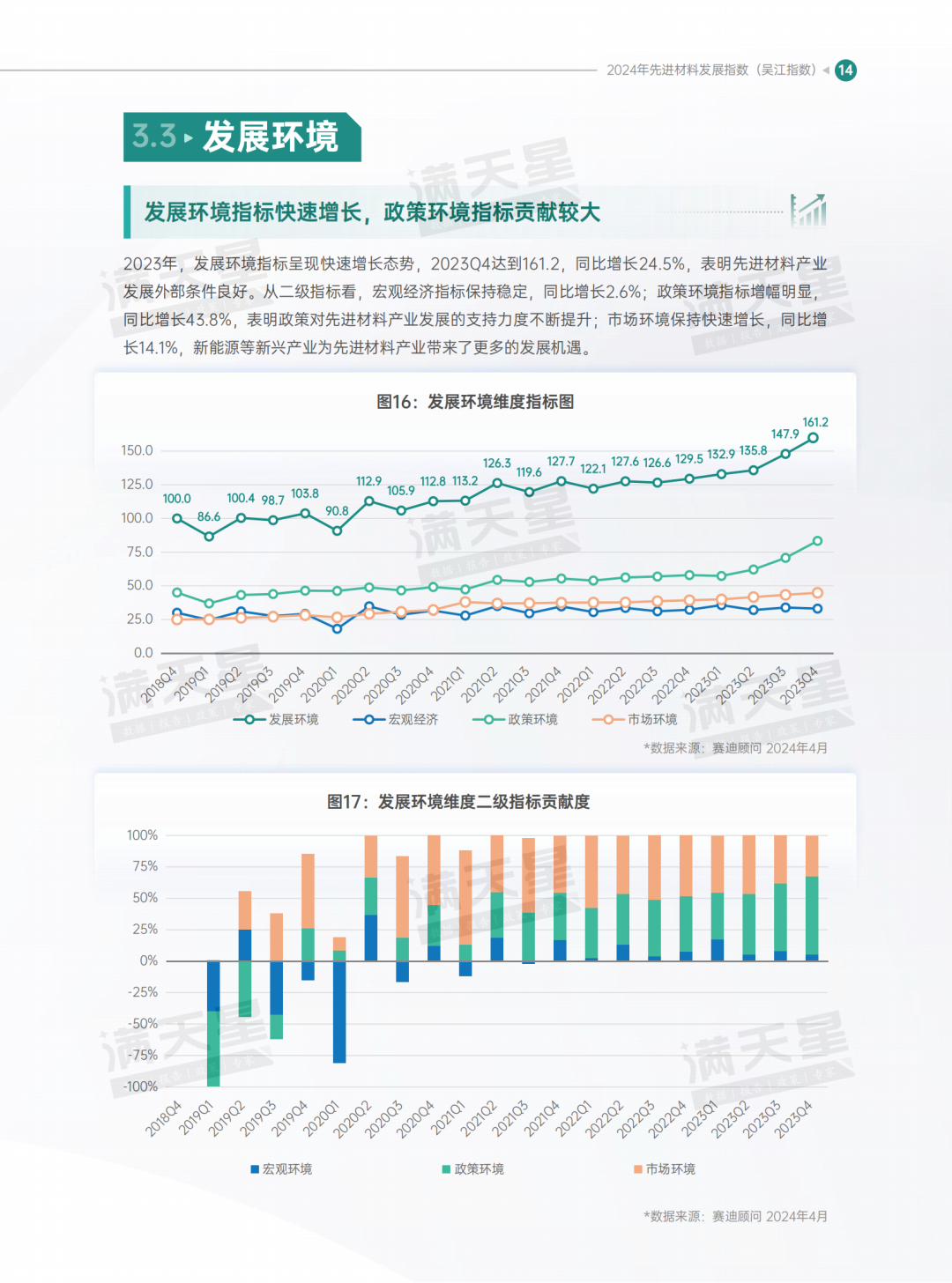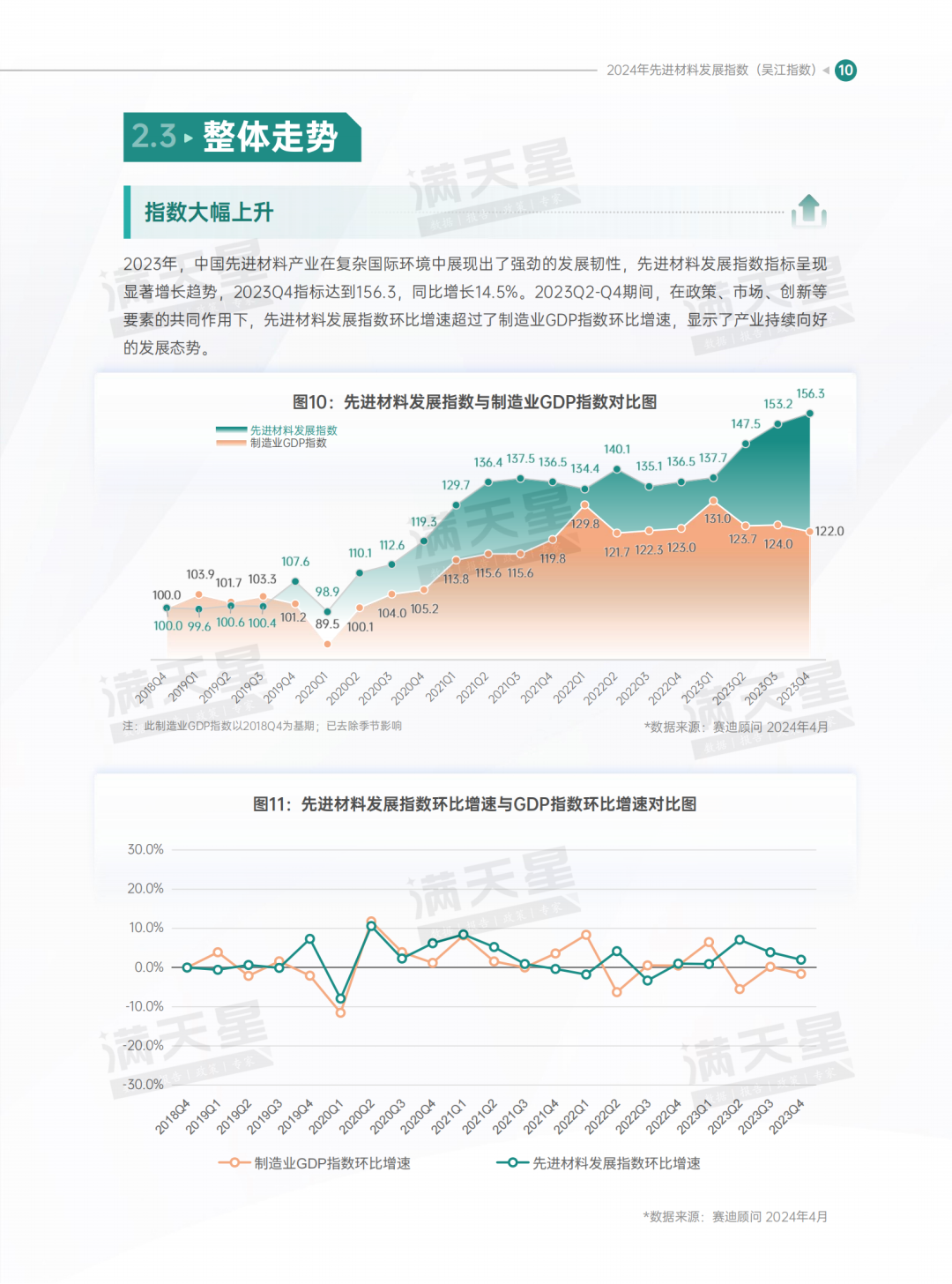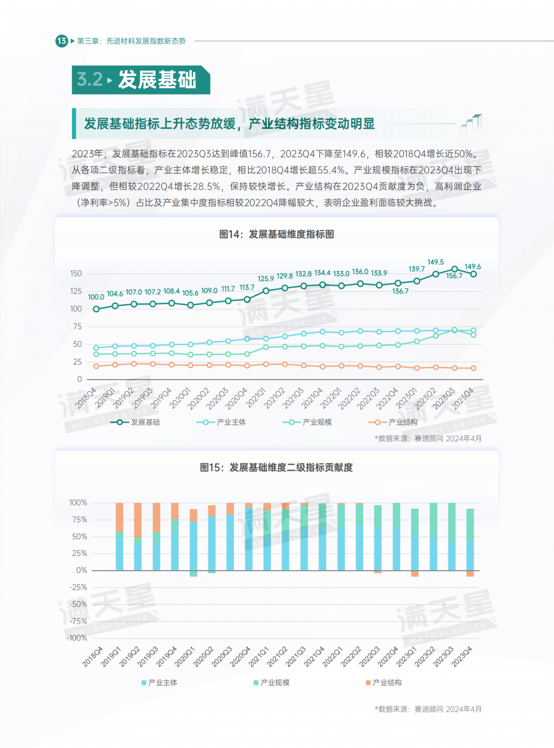 先进材料是抢占未来科技和经济发展制高点的重要领域之一,也是中国先进制造业发展的重要支撑。2023年,中国先进材料产业在复杂国际环境中展现出了强劲的发展韧性,先进材料发展指数指标呈现显著增长趋势,2023Q4指标达到156.3,同比增长14.5%。2023Q2-Q4期间,在政策、市场、创新等要素的共同作用下,先进材料发展指数环比增速超过了制造业GDP指数环比增速,显示了产业持续向好的发展态势。