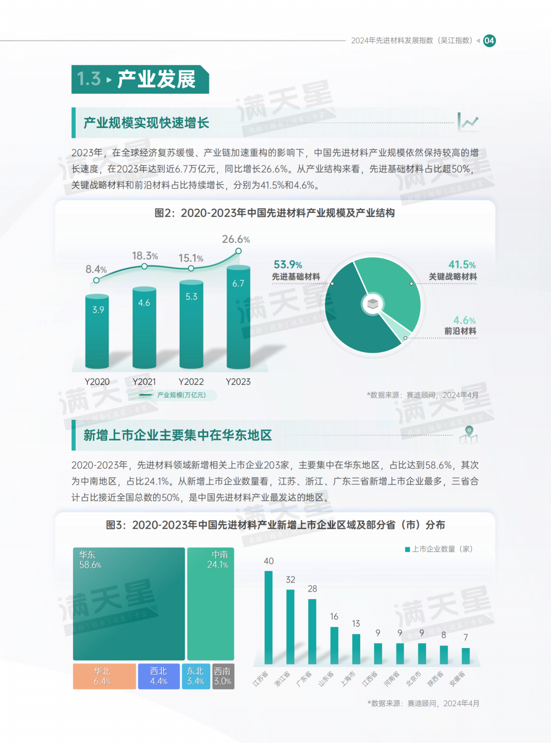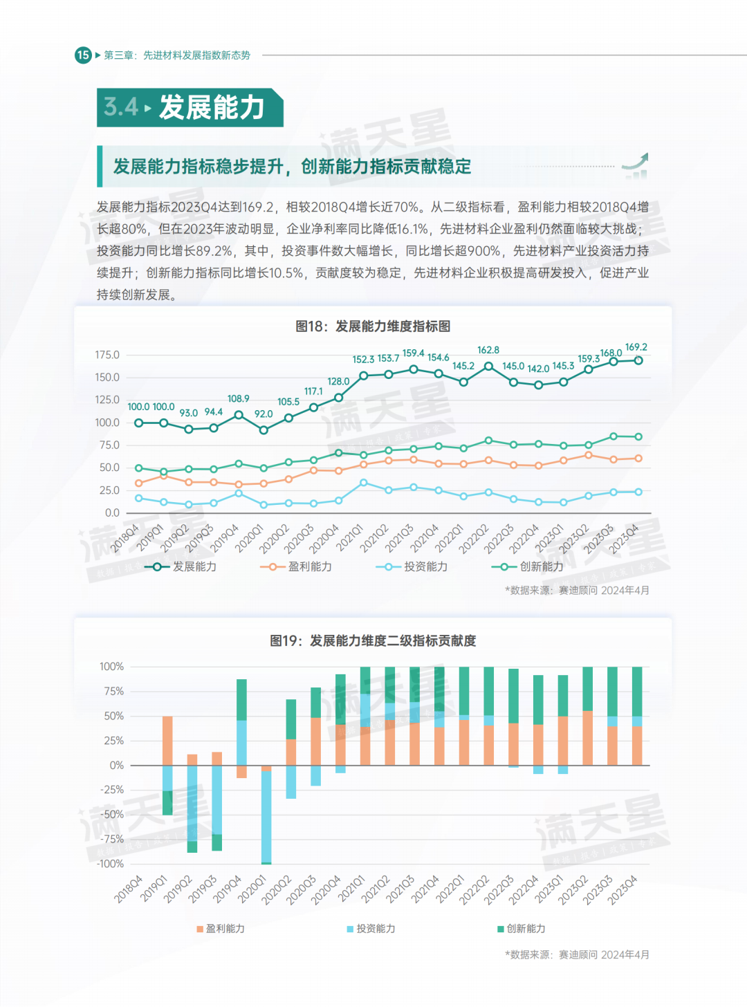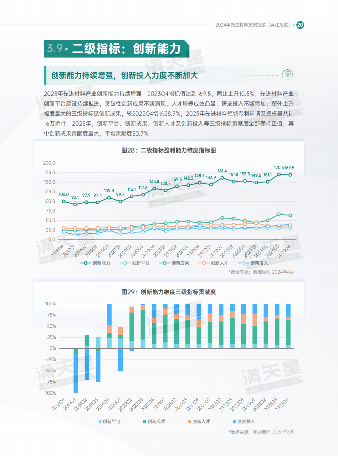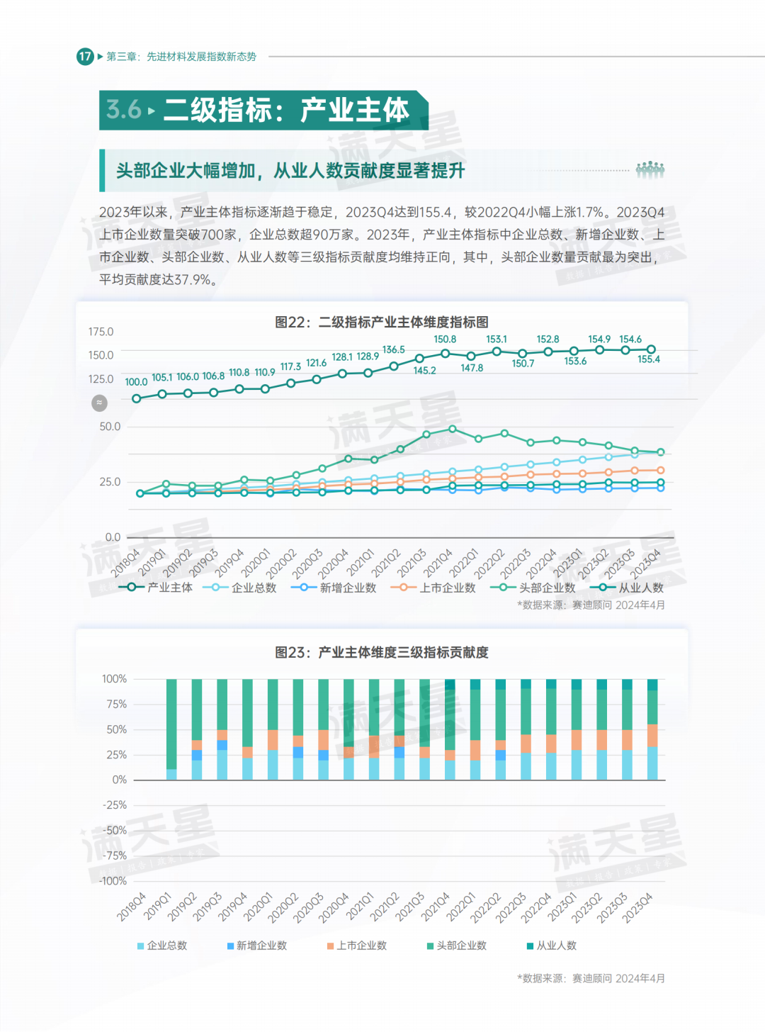 先进材料是抢占未来科技和经济发展制高点的重要领域之一,也是中国先进制造业发展的重要支撑。2023年,中国先进材料产业在复杂国际环境中展现出了强劲的发展韧性,先进材料发展指数指标呈现显著增长趋势,2023Q4指标达到156.3,同比增长14.5%。2023Q2-Q4期间,在政策、市场、创新等要素的共同作用下,先进材料发展指数环比增速超过了制造业GDP指数环比增速,显示了产业持续向好的发展态势。
