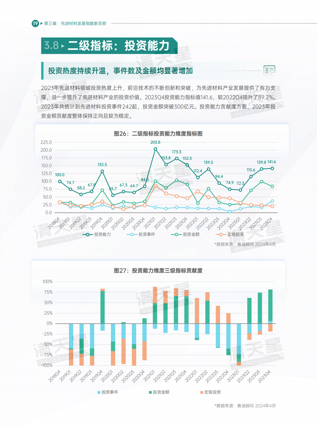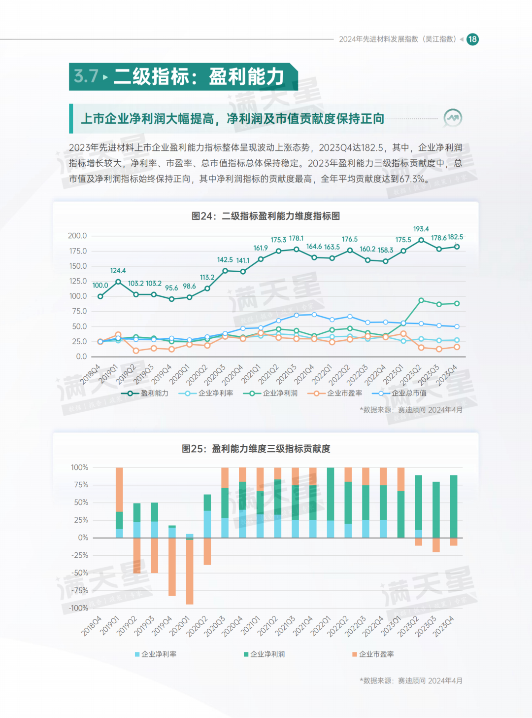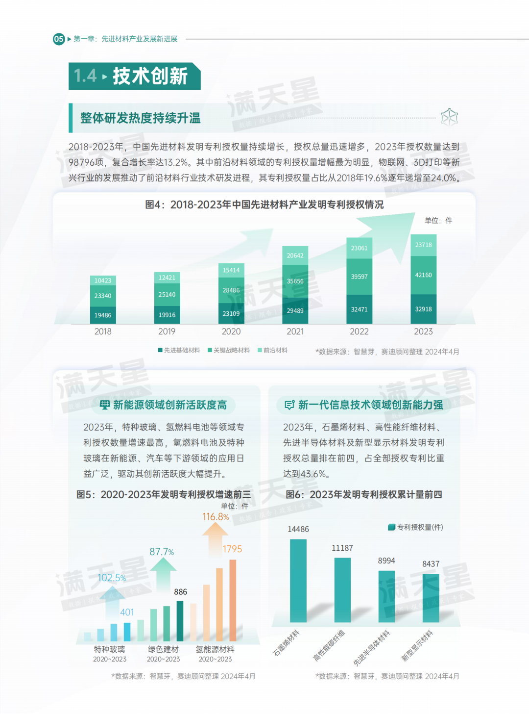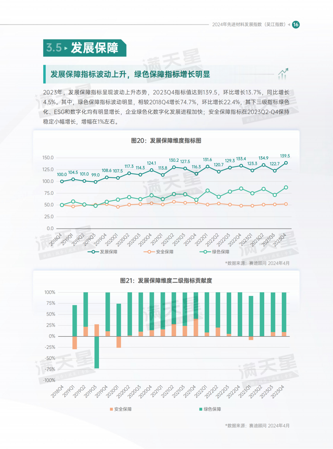 先进材料是抢占未来科技和经济发展制高点的重要领域之一,也是中国先进制造业发展的重要支撑。2023年,中国先进材料产业在复杂国际环境中展现出了强劲的发展韧性,先进材料发展指数指标呈现显著增长趋势,2023Q4指标达到156.3,同比增长14.5%。2023Q2-Q4期间,在政策、市场、创新等要素的共同作用下,先进材料发展指数环比增速超过了制造业GDP指数环比增速,显示了产业持续向好的发展态势。