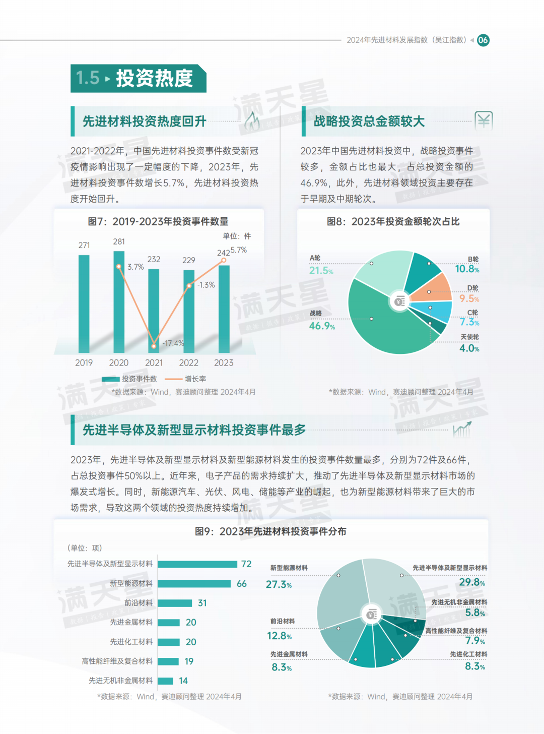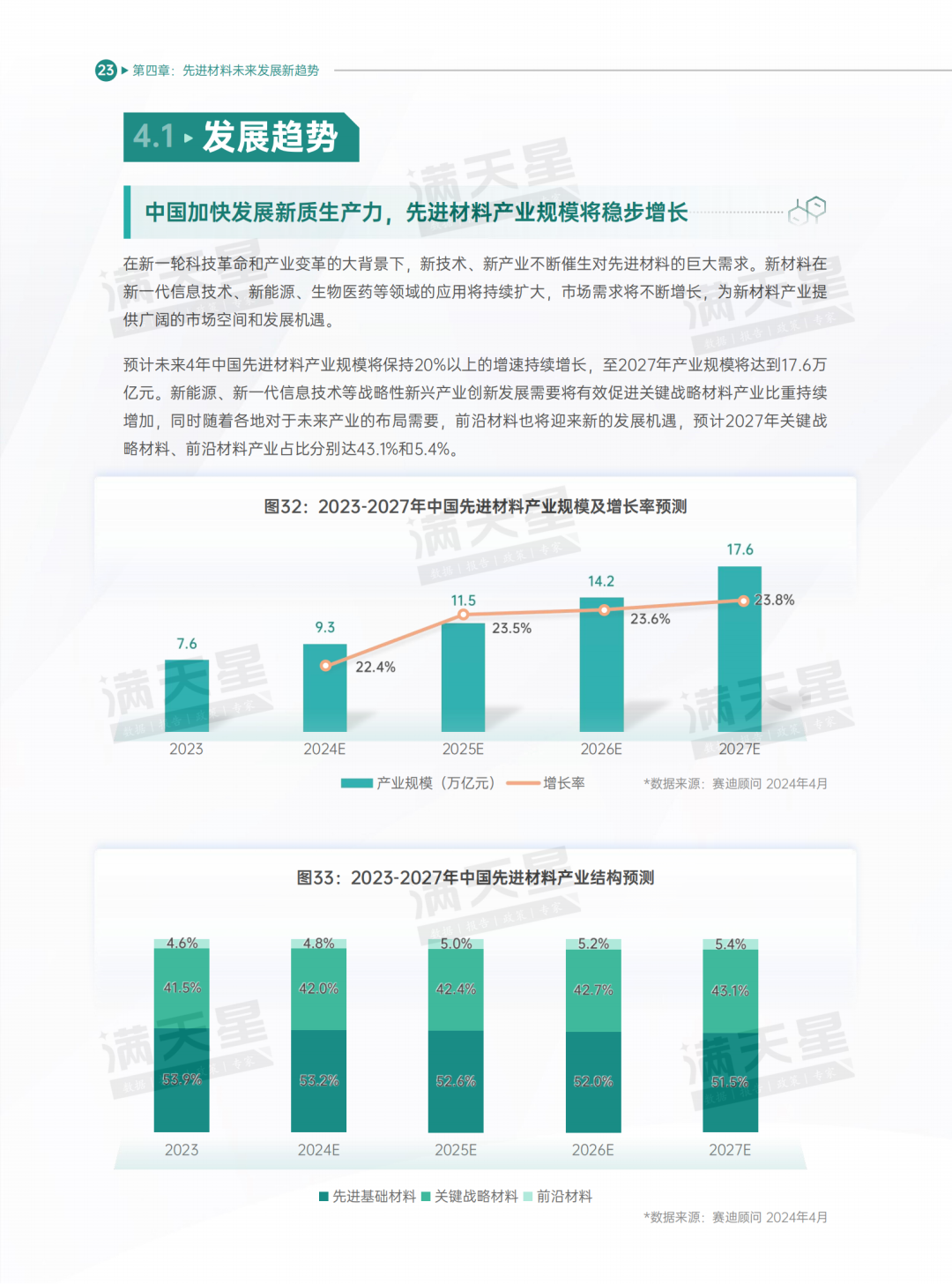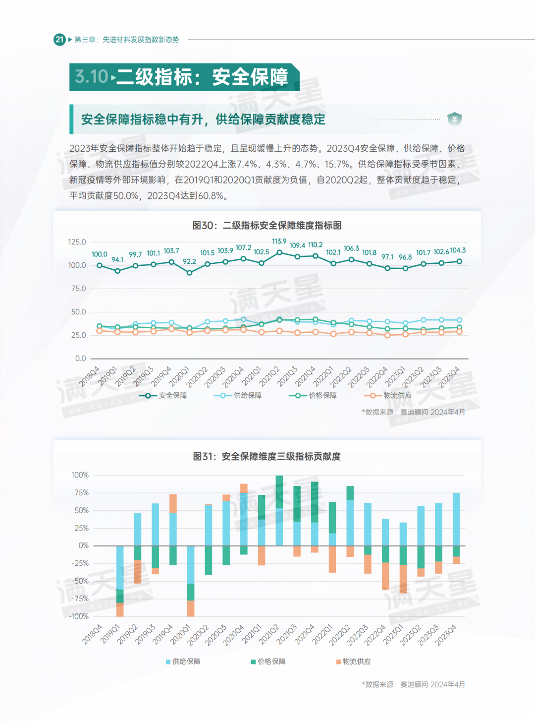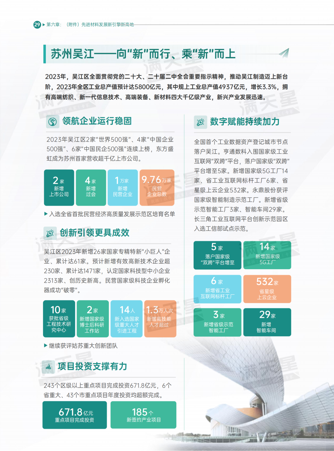 先进材料是抢占未来科技和经济发展制高点的重要领域之一,也是中国先进制造业发展的重要支撑。2023年,中国先进材料产业在复杂国际环境中展现出了强劲的发展韧性,先进材料发展指数指标呈现显著增长趋势,2023Q4指标达到156.3,同比增长14.5%。2023Q2-Q4期间,在政策、市场、创新等要素的共同作用下,先进材料发展指数环比增速超过了制造业GDP指数环比增速,显示了产业持续向好的发展态势。