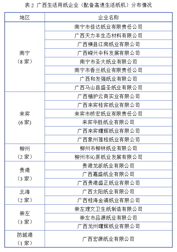 2023年,广西共23家生活用纸企业配备中高速纸机,分布在南宁、柳州、来宾、贵港、北海、崇左和防城港七个市(县)。具体分布情况详见表2。