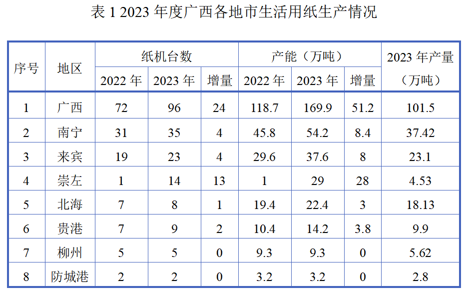 2023年,广西生活用纸中高速纸机产能分布在南宁等七个市(县),其中南宁地区产能为54.2万吨,产量为37.42万吨,均居广西第一。广西各地市生活用纸生产情况详见表1。