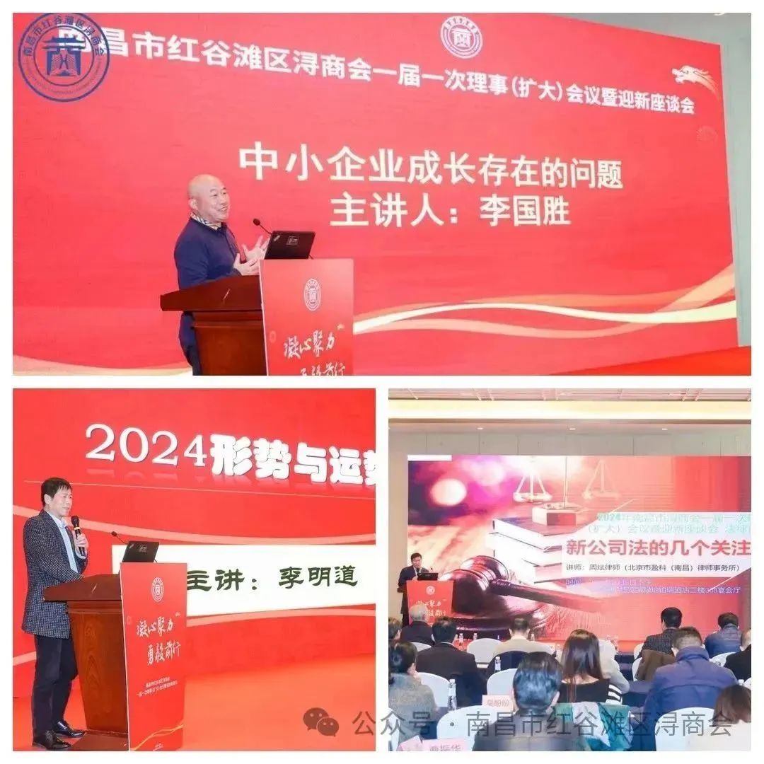 大会期间,商会执行会长李国胜、理事周斌、顾问李明道分别就《中小企业成长存在的问题》、《中小企业发展法律防范》、《2024年形势与个人运势》等三个主题发表了演讲。三位主讲人都从帮扶中小企业发展的角度出发,通过分析企业经营管理现状和遭遇的困难,给企业经营如何守正创新,如何规避法律风险指明了方向,并就2024年的宏观经济形势与个人运势以及企业家如何顺势而为等问题进行了剖析,为大家提供了有益的建议。