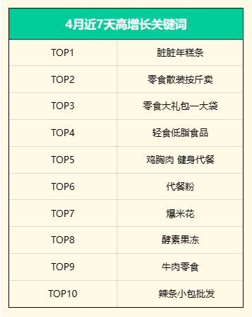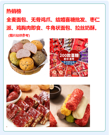 ★ 从热搜和高增长搜索词可以看出,到买家对于零食、特别是大包装零食,大礼包零食依然有非常大的需求,搜索人群主要集中在货架电商和直播电商。其次,大家对于夏季的热采的产品如饮料、啤酒、雪糕等食品,实现了高搜索、高访客、高询盘。