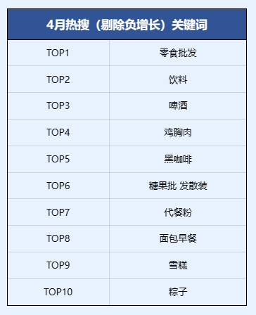 4月行业热搜高增长行业:冷饮、水/饮料、酒类、液体乳、茶叶、传统滋补品、保健食品、巧克力、其他休闲食品。