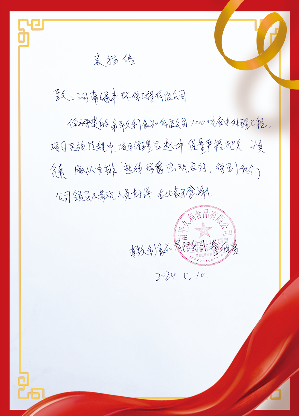 2024年5月10日,河南绿丰环保工程有限公司凭借其专业的工程实施能力和优质的服务态度,成功获得了南平久利食品有限公司的高度赞誉。