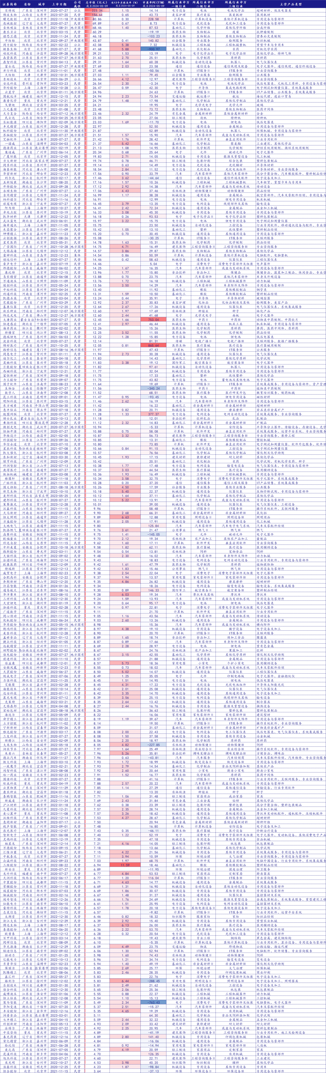 截至5月9日,北交所公司市值的算术平均值为14.15亿元,超95%的北交所上市公司市值在30亿以下。从地域分布看,江苏省数量最多,广东次之,浙江第三。从公司属性看,民营企业约占86.7%。从行业分布看,主要集中在机械设备、电力设备、基础化工、计算机、汽车、医药生物。从股息率看,近12个月股息率算术平均值(仅包括数据可查部分)为2.36%。从市盈率看,过半数公司市盈率(TTM)在10-30倍之间。