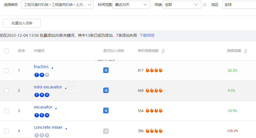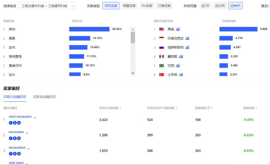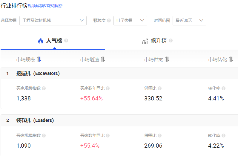 市场参谋(机械大类):工程机械大类在阿里国际站属于热门行业和增长型行业,现已成为一级产品类目,颗粒度可以按二级三级及叶子类目进行分析。目前叶子类目挖掘机排名第一;根据人气榜、飙升榜、蓝海榜和效果榜四个维度进行分析。