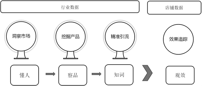 跨境电商的数字化运营策略从“人”、“品”和“词”三条主线,洞察市场机会、挖掘机会商品、精准引流和查看店铺数据效果。从懂人、察品、知词、观效四个维度进行布局。如下图1所示: