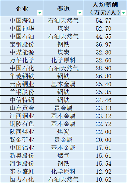 在石油天然气行业,三家大型企业的人均薪酬均超过28万/人,其中中国海油的薪酬最高。在煤炭行业,中国神华的薪酬超过50万/人,其他两家头部企业的薪酬均超过30万/人。钢铁行业中,宝钢股份的薪酬最高,超过36万/人,而其他钢铁企业的薪酬均不超过30万/人。在有色金属板块,云南铜业的薪酬最高,超过25万/人,其他企业的薪酬介于17-23万/人之间。在化工板块,万华化学的薪资最高,超过30万/人,而恒力石化和东方盛虹等企业的薪酬不高,均不超过13万/人。