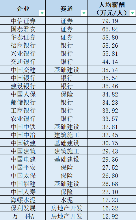 银行板块的薪酬普遍较高,人均薪酬均超过30万/人。相比之下,保险领域的薪资一般,基本不超过30万/人,而证券领域的薪酬则更高,中信证券、国泰君安、华泰证券等公司的人均薪酬均超过50万/人。在地产板块,两家头部企业的薪酬分别为万科13万/人(包含物业)和保利发展16万/人。在建设板块,几家大型央企的人均薪酬约为30万/人。至于建材板块,海螺水泥的人均薪酬为17万/人。