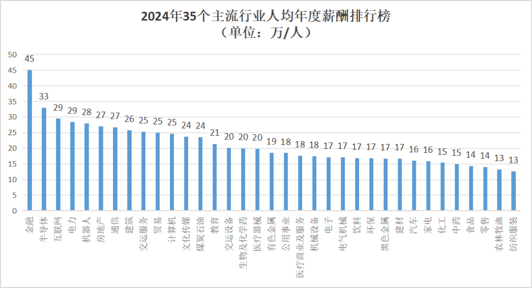 根据2023年财报数据,分析各行业人均薪酬,具体结论如下:人均薪酬排名前十强行业:金融、半导体、互联网、电力、机器人、房地产、通信、建筑、交运服务、贸易。