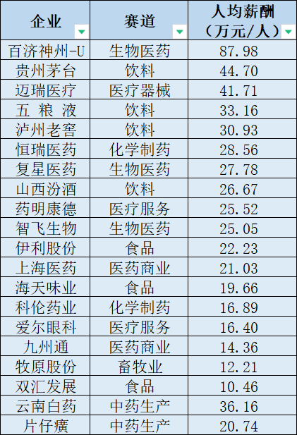 在生物制品板块,百济神州的人均薪酬最高,达到88万/人,智飞生物则为25万/人。在化学制药板块,恒瑞医药的人均薪酬达到28.56万/人,而科伦药业则不超过20万/人。中药板块中,云南白药的薪资较高,达到36万/人,片仔癀的人均薪酬也高达20万/人。在医疗器械板块,迈瑞医疗的薪资超过40万/人,而CRO龙头企业药明康德的人均薪酬为25万/人。医疗商业板块中,上海医药和九州通的人均薪酬均不高,介于14-21万之间。在饮料板块,贵州茅台的薪资最高,超过40万/人,而五粮液、泸州老窖和山西汾酒的薪资均超过25万/人。最后,在食品板块,海天味业、牧原股份、双汇发展等企业的薪资均不高,均不超过23万/人。