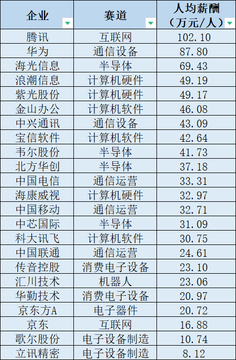 算机硬件行业整体薪酬较高,浪潮信息、紫光股份和海康威视的人均薪酬均超过30万/人。与之相似,计算机软件赛道的整体薪酬也相当可观,科大讯飞、金山办公、宝信软件等市值前三强企业的人均薪酬也都超过30万/人。互联网行业的薪酬差距颇大,腾讯的人均薪酬超过100万/人,而京东则不到20万/人。通信设备企业的人均薪酬也属于较高水平,华为的人均薪酬超过80万/人,中兴通讯也超过40万/人。通信运营的三家龙头企业的人均薪酬介于24-33万/人,中国电信的人均薪酬最高。半导体行业的人均薪酬同样较高,中芯国际、韦尔股份、北方华创和海光信息的人均薪酬均超过30万/人。在机器人领域,汇川技术的人均薪酬为23.06万/人。消费电子领域的传音控股、华勤技术等企业的人均薪酬约为20万/人,而代工企业如立讯精密和歌尔股份的薪酬较低,仅约为10万/人左右。