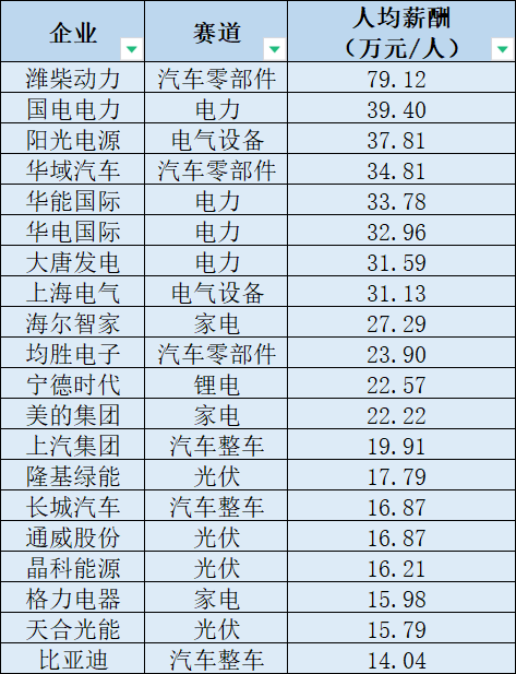 电力企业人均薪酬普遍较高,如国电、华能、华电、大唐等,均超过30万/人。这主要是因为电力行业央企较多,一些部门采用全外包方式,不计入员工总数。此外,电气设备领域的领军企业阳光电源和上海电气的人均薪酬也在30万/人以上。相比之下,汽车整车企业如上汽集团、长城汽车、比亚迪等人均薪酬较低,均未达到20万/人,其中比亚迪更是仅有14万/人。而在汽车零部件领域,潍柴动力的人均薪酬最高,接近80万/人。这主要是因为该公司的海外业务占比较高,超过50%,而海外薪酬明显高于国内。另外,华域汽车和均胜电子的人均薪酬也超过20万/人。锂电龙头企业宁德时代人均薪酬为22.57万/人,高于其他锂电同行,光伏头部企业隆基绿能、通威股份、晶科能源和天合光能人均薪酬介于15-18万/人。家电行业人均薪酬差距较大,三大家电企业中,格力电器垫底,人均薪酬为15.98万/人,海尔智家最高,达到27.29万/人。