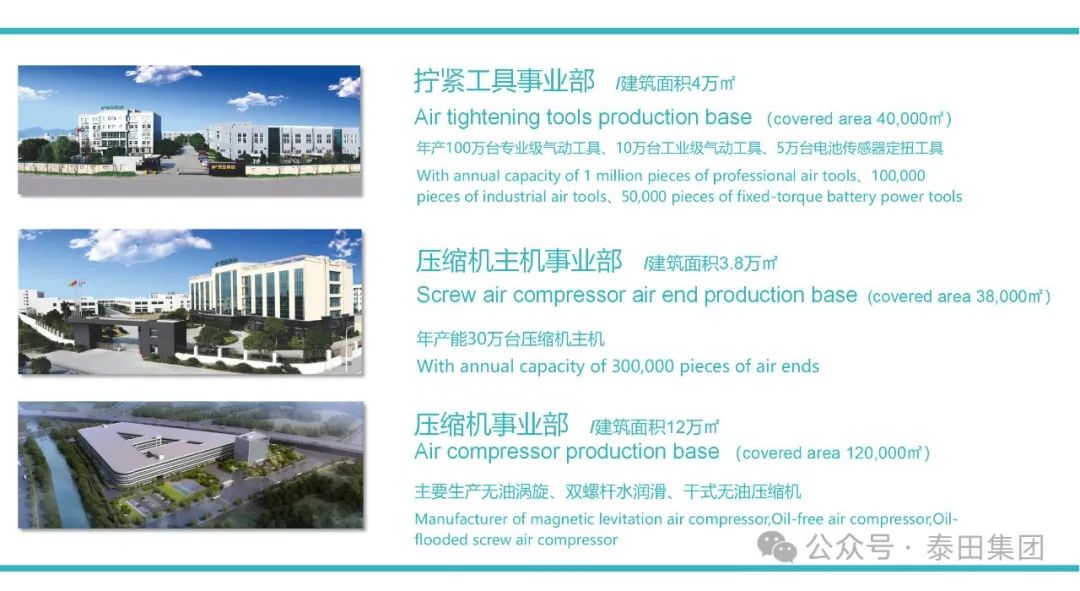 泰田集团股份有限公司成立于2000年,是一家集研发、销售、生产为一体的国家高新技术企业,国家专精特新“小巨人”企业,拥有拧紧工具、压缩机主机、高端节能压缩机三大生产基地。