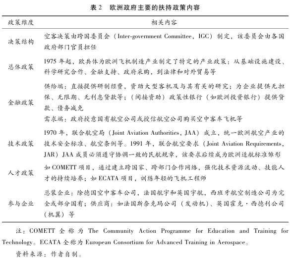 那么在“有限的”差距面前,欧洲企业能否通过市场主导模式实现技术追赶?实际上,空客成立之初并非没有争取过私人资本,但高昂的投入成本(20—40亿美金)和超长的投入产出周期(10—14年)阻碍了私人资本的投资意愿。最后,德国、法国、英国政府不得不出面资助。据估计,空客飞机系列中的每一款机型的开发运营给企业带来的现金流都是负的(GRA, 1990),也因此在市场机制逻辑下,企业也很难获得私人资本的青睐。空客追赶时期在市场中遇到的困境也是行业的普遍遭遇,私人企业/资本不会自发进入该产业(Krugman,1988)。即便是行业霸主、技术成熟的波音,其为新项目融资也时常被私人资本拒绝,最终不得不依靠美国政府的长期支持(军品采购、NASA和军方在基础研发项目的投入等)才能保持稳定的利润并持续研发技术(CEC, 1997)。所以,在“政府vs. 市场”模式的竞争中,市场主导模式的落败使得政府扶持模式成为更理性的决策。面对“有限的”技术差距,欧洲最终通过政府扶持模式完成了民用航空产业的技术追赶。如表2所示,欧洲政府通过跨国协商给予空客全方位的政策支持。那么,欧洲政府的支持是如何通过行政指导与制度网络帮助企业进行技术积累与技术整合的?
