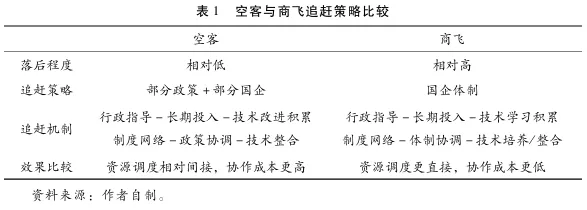 综合上述对空客和商飞的追赶起点、追赶策略以及追赶后果的分析,可以发现政府支持(直接或间接)模式为战略性产业技术追赶实现长期技术积累与技术整合提供了市场主导模式难以匹敌的必要条件。同时,比较空客与商飞的差异也能发现,起点越落后,越需要政府通过直接扶持手段为技术学习、积累与整合提供条件。商飞面临几乎从零开始的技术起点,不仅需要更多资金、更长时间才能实现技术学习与积累,而且在国内也难以寻觅到符合国际标准的供应商,需要更有效的组织协调能力建立产业链。因此,采用更直接的国企体制作为抓手,通过行政指导获得更广泛与更持久的资源,通过国有体制为核心的制度网络降低协调成本、促进合作共赢,才可能突破层层困境,实现追赶。