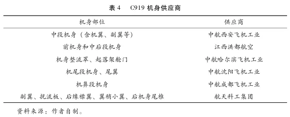 在行政指导之外,中国政府采用国有体制建立起更为紧密与稳定的制度性网络。商飞由原上海航空工业、中航一集团、中航二集团等下辖部分企业组建而成,这说明商飞本就是中国国有航空资源整合的结晶。基于相似的组织运作逻辑与丰富的合作历史,商飞与中国航空体系中的供应商建立起了稳定的制度网络。如作为商飞主供应商的中航集团,该集团下的众多子企业与商飞前身早在20世纪90年代与麦道共同研制MD-90时就有共同协作的经历。基于过往协作经验,中航集团承担了C919 的静力试验、试飞试验、八大部分机体结构制造(机体部分供应商如表4所示),与商飞合作研制了17个机载系统,等等。此外,商飞还与中国航天科技集团、中国航天科工集团等全国200多家企业建立技术合作网络。除了在国企内部建立起稳定的协作网络外,共同的体制背景也让商飞成功建立起“政-产-学-研”的合作网络。历史上,各航空类高校本就为培养航空企业人才而建立,即便高等教育体系和国有企业经历多轮改革,但这种紧密的合作关系仍然持续至今。也因此,商飞能够与北京航空航天大学、南京航空航天大学、上海交通大学等全国12所顶尖的高校与科研院所建立长期的人才培养与技术合作网络。由此可见,与欧洲通过跨国政府协商、颁布政策建立制度网络不同,中国以国有体制构筑的制度网络则更紧密、更稳定。与欧洲各国协商与政策引导的组织调配体系相比,这种制度网络协调成本更低,谈判困境更少。