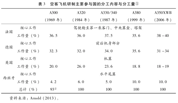 西欧政府除了制定长期目标、提供长期资源投入外,还利用政治协商与行政政策推动建立了大量跨国家、跨层次、跨部门的制度网络,为空客协调技术与人才资源,帮助其实现技术整合。这一跨国技术分工与合作网络的建立也是促成空客成功的最关键因素。如前文所述,飞机作为高度复杂系统需要集成大量高端技术,而西欧没有任何一个国家能够独立高效掌握所有技术,所以跨国合作成为必然选择。西欧各国政府通过政治谈判(Ahrens, 2019),以各国技术优势为原则,建立了技术合作与工作量分工的网络。例如,法国凭借其机身设计方面的显著优势,获得了大部分与机身研制相关的工作;英国拥有当时全球最前沿的机翼研制技术,因此承担机翼部分的工作等。因为合作不受市场波动影响,所以各国维持着长达数十年稳定的制度网络,核心工作内容的分工几乎不变(见表3)。这种稳定性甚至不受各国政府首脑、执政党变动的影响。除此之外,欧洲还通过各类行政政策建立并强化产业、高校与工程院校的技术与人才交流,如表2中的COMETT项目、ECATA项目等。同样地,此类网络受政策规则引导与约束,往往也能保持不受市场环境或个人因素的影响。
