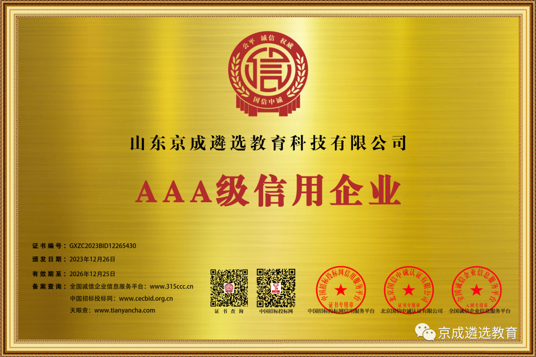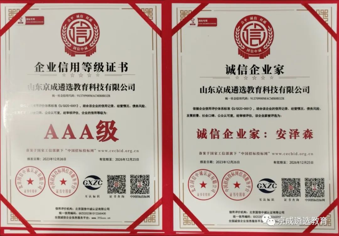 京成遴选教育AAA级信用企业信用等级证书、诚信企业家