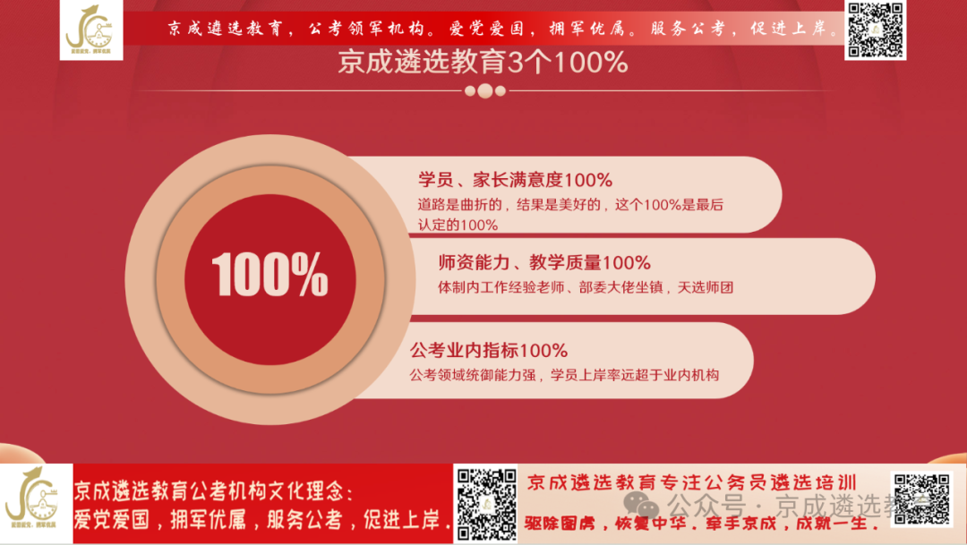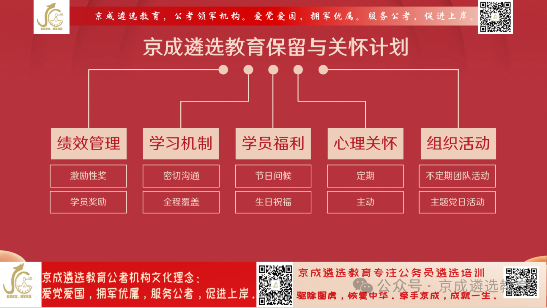 京成遴选教育定位高、起点高,创立即巅峰!在企业文化建设方面,公司创始人沄泽师兄工作履历决定公司始终坚持爱党爱国、全心为民,服务公考,促进上岸为企业发展注入源源不竭的动力,并将该理念贯穿于学员的日常培养中,培养后的学员具备强大的政治定力和爱党爱国精神,为日后体制内工作打下坚实基础!