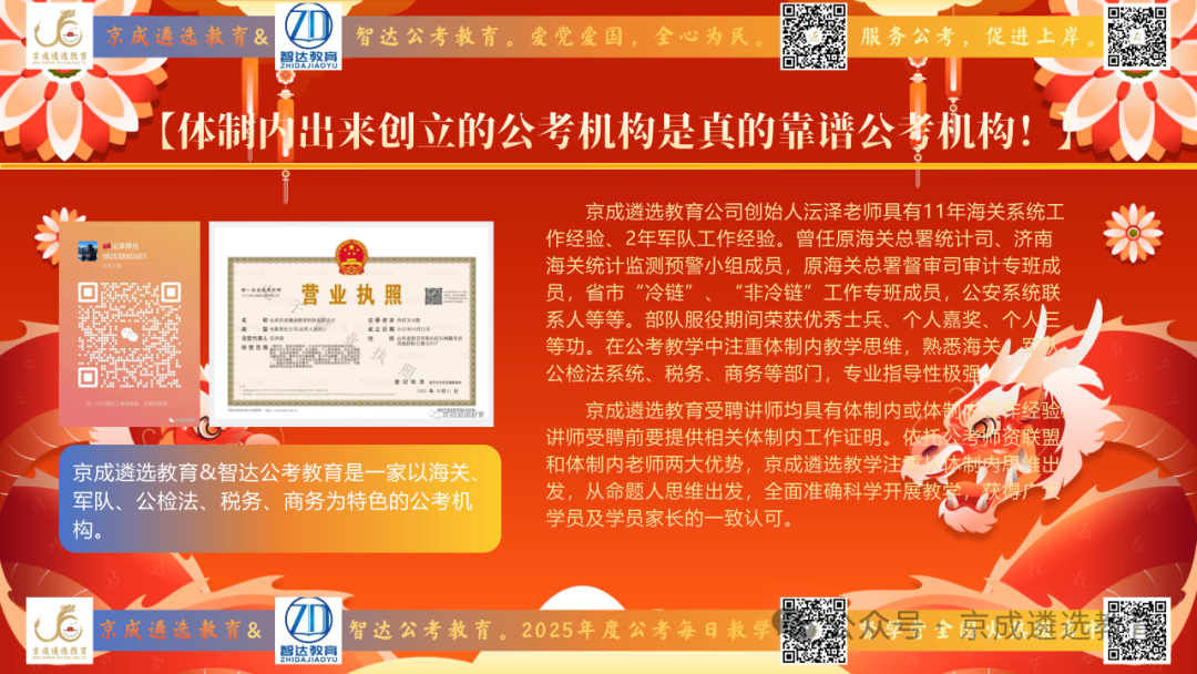 京成遴选教育是一家以海关、军队、公检法、税务、商务为特色的公考机构。京成遴选教育公司创始人沄泽老魔中国管理科学研究院公务员遴选培训客座教授,具有11年海关系统工作经验、2年军队工作经验。海关总署、直属海关、隶属海关不同层级工作经历,2年军队工作经验中服役于中国人民解放军63710部队、63729部队(原中国人民解放军总装备部中国太原卫星发射中心司令部、技术部)。原海关总署统计司、济南海关统计监测预警小组成员,原海关总署督审司审计专班成员,省市“冷链”、“非冷链”工作专班成员。深知海关、军队、公检法系统、税务、商务等部门,在公考教学中注重体制内教学思维,专业指导性极强。